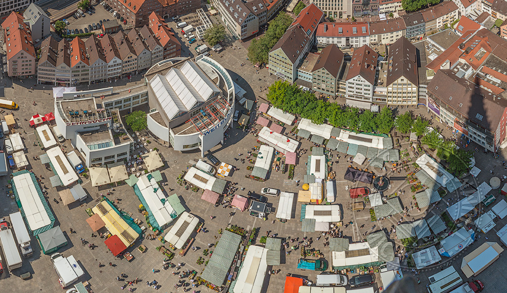 Die Perspektive wurde so gewählt, dass entfernte Objekte im Horizont gleichzeitig mit den Marktständen auf dem Münsterplatz gemeinsam abgebildet werden.