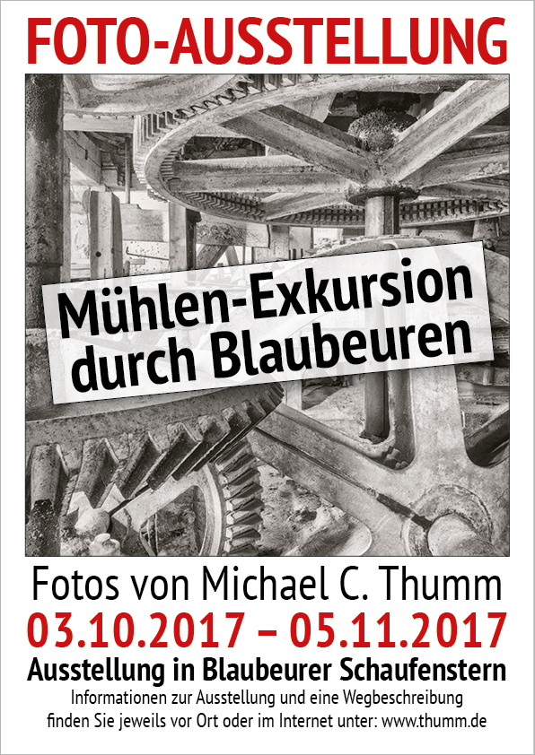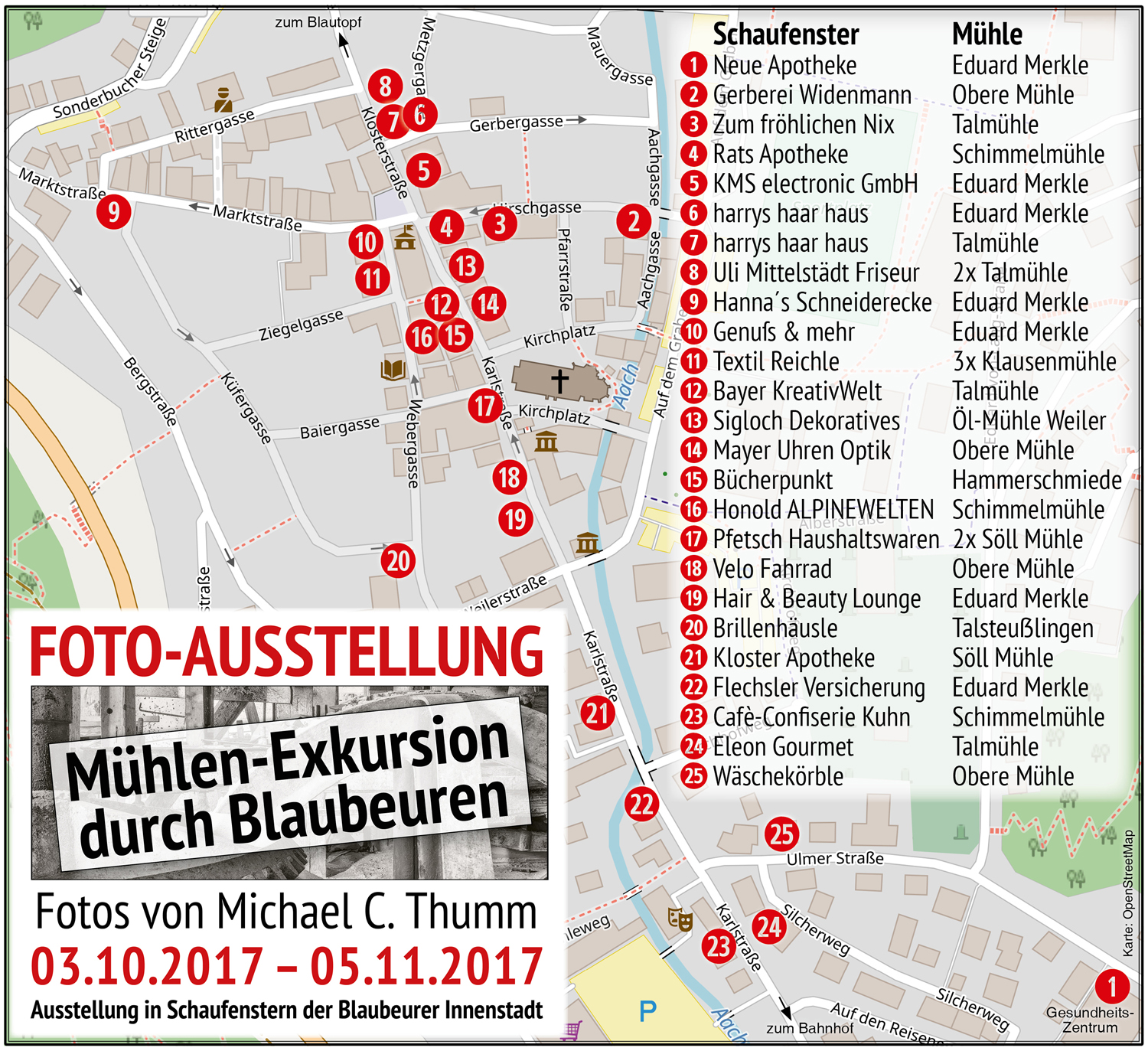Mein Dank gilt den Mühlenbetreibern, die für meine Idee offen waren und mir für mein künstlerisches Vorhaben die Türen öffneten. Ganz besonders danke ich den Blaubeurer Geschäftsinhabern, die mir ihre Schaufenster so hilfsbereit und unterstützend für meine Ausstellung zur Verfügung gestellt haben.