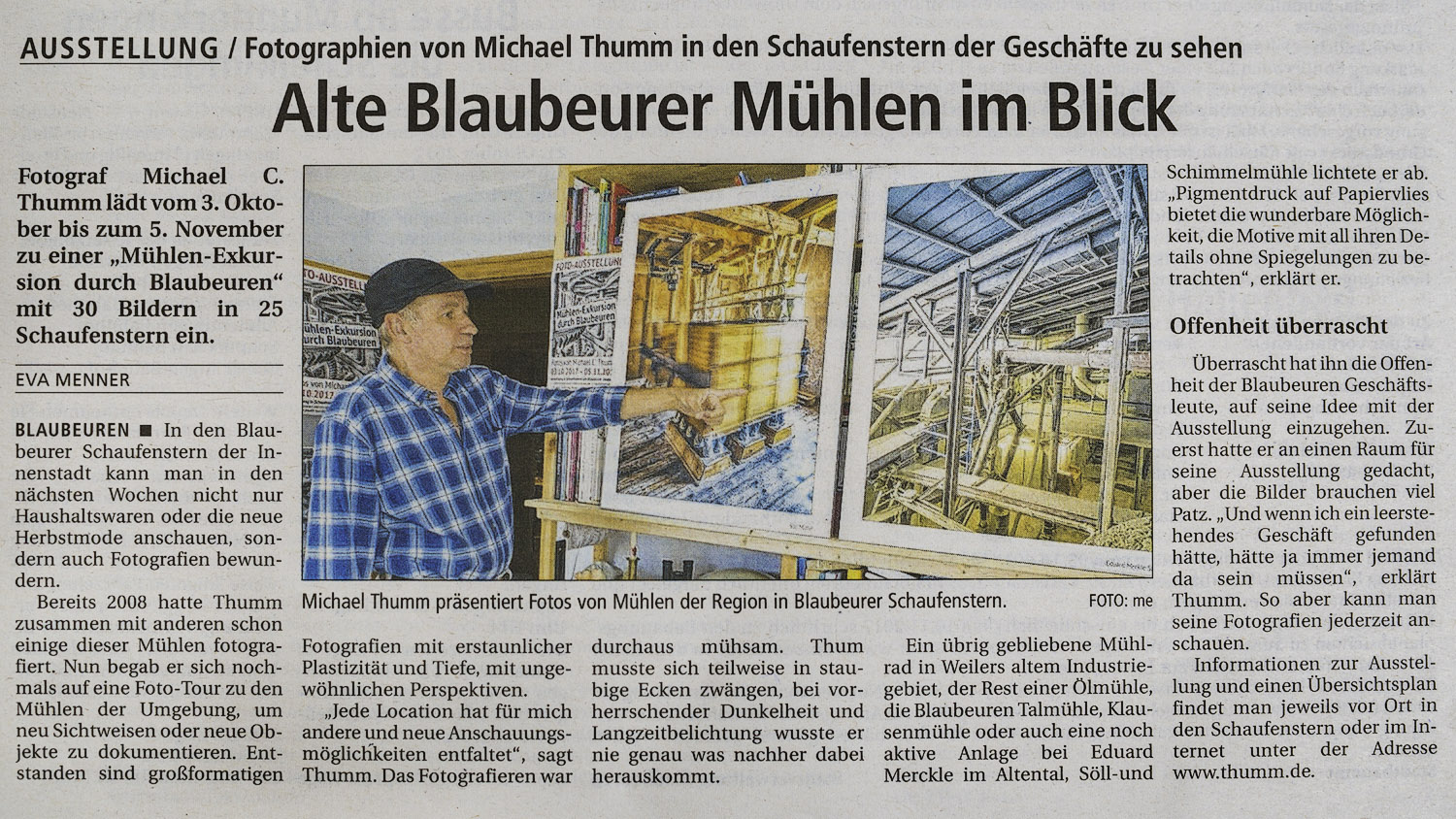 Ausgestellt sind insgesamt 30 Aufnahmen aus der Schimmelmühle und der Klausenmühle am Blautopf, der Söll Mühle in Gerhausen, der Oberen Mühle und der Öl-Mühle an der Ach in Weiler. Ebenso sind Fotografien aus der Steinmühle „Talmühle“ in der Stadtmitte und der Eduard Merkle Steinmühle im Altental zu sehen.
